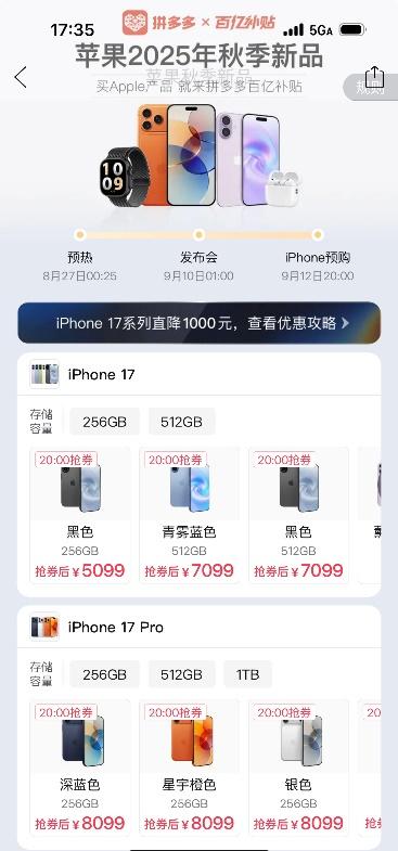 9月12日晚8点,拼多多百亿补贴正式上线苹果2025年秋季全系新品,并推出史上最大力度的补贴福利,iPhone 17系列新品开售直降1000元,持续给广大消费者带来“最香”体验。